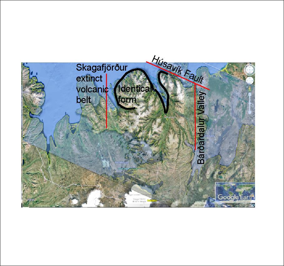 The consistency is not only found to be intriguing becuse it ‘fits’ well, but because the rotation is half of that between the Strandir region and the East Fjord area. It is interesting to see how the Hornstrandir version of the peninsula east of Eyjafjörður has been removed by the Húsavík Fault System. It can also be seen that Arnarfjörður is narrower than Skagafjörður. It can be explained by the fact that for about a million years Skagafjörður was a volcanic zone taking part in the tectonic drift. Arnarfjörður is 6 km wide, compared with 16 km of Skagafjörður, which means that the widening of Skagafjörður during that period of time was close to 1 cm each year.