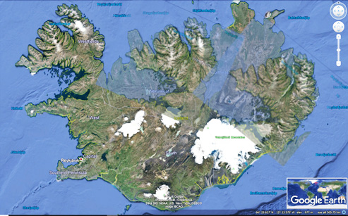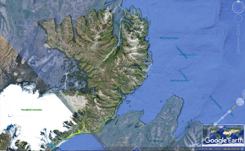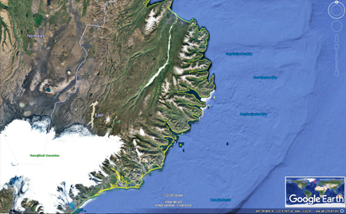 Down below, The NW Peninsula of Iceland (Vestfjarðakjálkinn) has been superimposed on a map of the Eastern Fjords. The coastlines are almost identical and also the inland features. Can this be explained? If originally built up in a parallel way, the shape can become more and less identical. The two coastlines are surprisingly similar. Similarities can be examined in a scientific way, calculating the probability that they will occur.