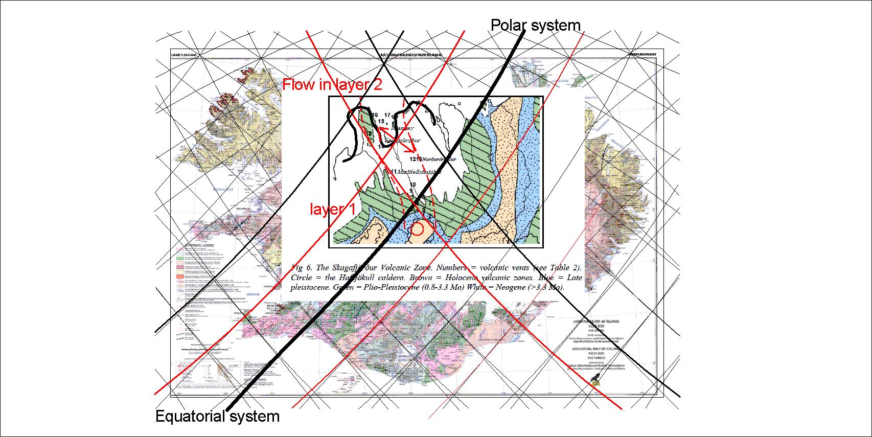 The Northern Reykjanes Ridge Rolls (with upwelling division line) excerts force to the east within the volcanic zone, pulling against the main tectonic drift to the west, thereby causing rifting within the area. The line below adds to the trend, marking the western front of the volcanic zone with a SE-NW alignment. During a million years the zone was active. Today the rift zone east of the main mantle division line (the wide black line) is responsibile for all the drift within that latitude.