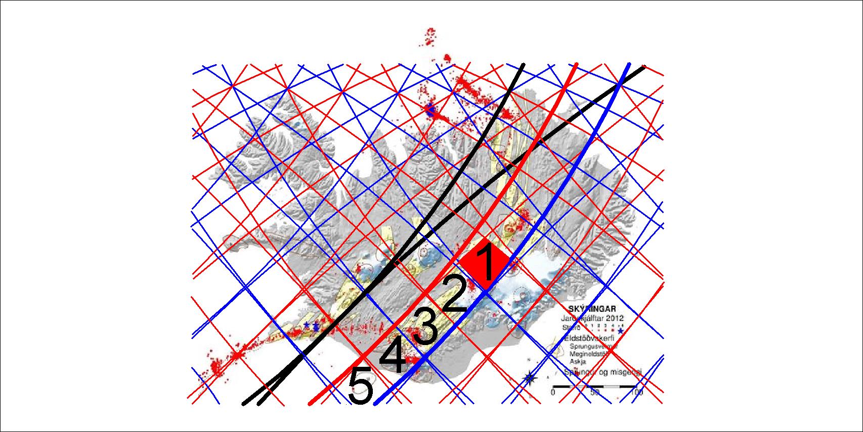 Each of those polygons is somehow special, and No. 1 fits the area often pointed out as the hot spot of Iceland. It is being pulled to the east and south (as the blue lines show local downwelling) against the main drift direction towards NW. No. 2 and 3 belong to rift zone, but 4 and 5 are sometimes called South Volcanic Zone, because it all belongs to the Eurasian tectonic plate and is not being torn apart. No. 4 is the area of Eyjafjallajökull and Mýrdalsjökull, and No. 5 is the polygon of Vestmannaeyjar.