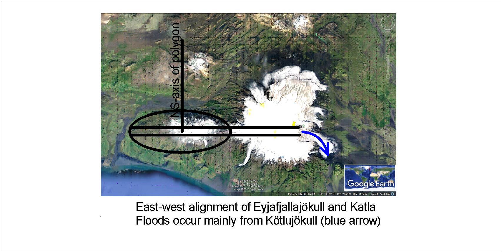 Try to look at Eyjafjallajökull and Mýrdalsjökull on Google Map yourself, and trace the EW-axis. The reason can be understood by referring to the pattern of magma currents under the tectonic plates of the Earth.