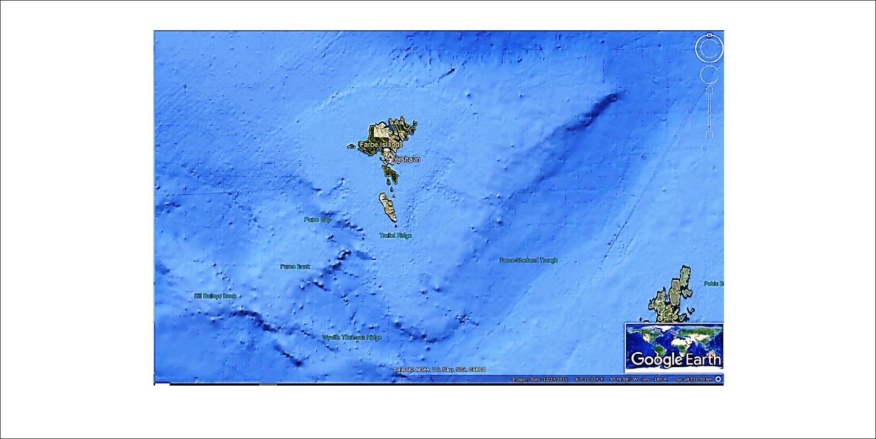 East of the islands, the Faroe-Shetland Trough seperates the two island clusters. West of the Faroe islands, the Faroe Gap plays a similar role.