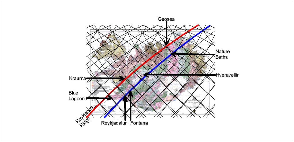 The Reykjanes Ridge can be extended over Iceland (red line), explaining the location of several geothermal spa sites in Iceland.