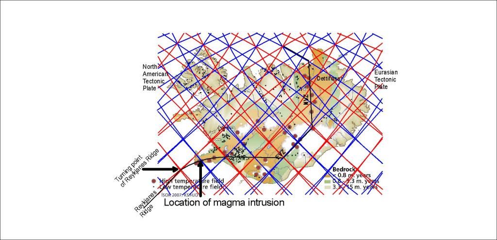 The regular bow of tectonic division line from Hveragerdi to the Reykjans Ridge is mirrored around the point close to the Blue Lagoon and Grindavik.