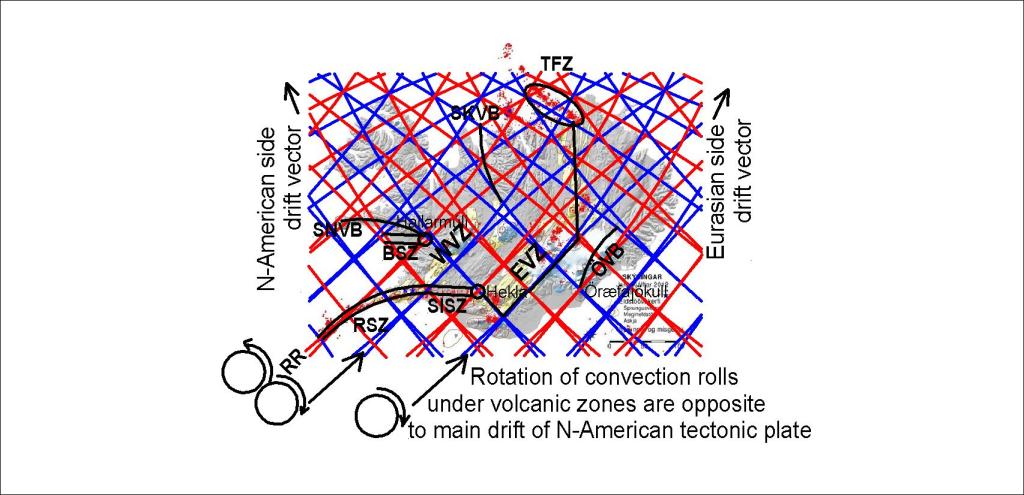 Without this grid, the reasons for the location of all those volcanic zones and earthquake zones become obscure. The similarity between the position of SISZ with Hekla and BSZ with Hallarmúli is pointed out specially. Hekla and Öræfajökull appear at the same kind of crossings, 3° apart on the same latitude. The difference between the mountains can be explained, as Hekla is at the edge of a rift zone, whereas Öræfajökull is not. Tjörnes Fracture Zone is aligned along the convection division lines. The South Iceland Seismic Zone polygon is found both south and north of the division line of the tectonic plates. The southern end drifts eastwards, while the northern end drift has a component to the west. Therefore it breaks in the middle in a way known as the bookshelf pattern.