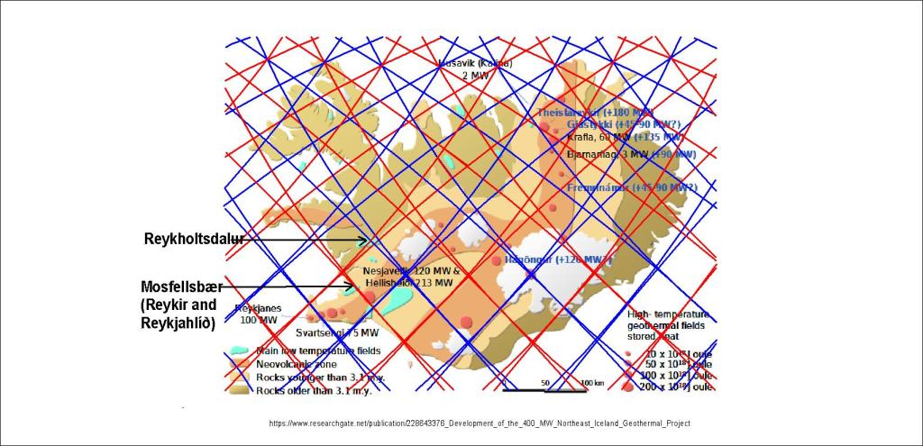 The alignment is found to be the same as of the calculated NW-SE lines. Therefore it can be reasoned that the geothermal activity is associated with three factors. First an old high temperature area that has cooled down, second the fissure swarm from Krýsuvík and Trölladyngja, and thirdly from the effect of the edge of the relevant polygon, whereas two division lines of convection rolls are found underneath the geothermal fields.