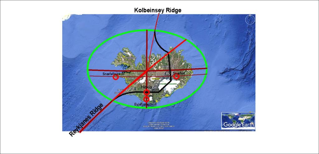 The Icelandic platform forms an ellipse around the extension, aligned E-W. The two volcanoes of Hekla and Eyjafjallajökull are on the NS axis of the ellipse. The two outposts of Icelandic volcanoes, Snæfellsjökull and Snæfell, are equadistant from the NS axis, and located exactly on the same latitude. If the Kolbeinsey Ridge is also extended, it is found reaching the same central point, merging with the NS axis of the ellipse and the volcanoes Hekla and Eyjafjallajökull. This high degree of consistency is in conformity with the analysis of the convection rolls below Iceland.