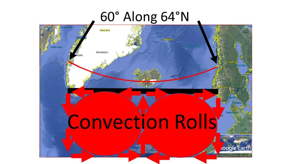 The distance between W-Greenland and W-Norway along the 64th parallel shows the location of large convection rolls below 410km depth.