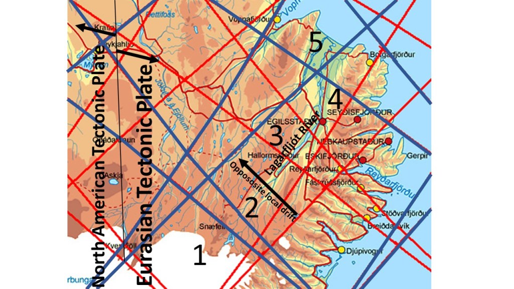 We can then analyse the Lagarfljót River according to the relevant polygons. Polygon 1 does comprise the origins at Vatnajökull, Snæfell and the upper most reaches. Then the valleys of polygon 2. Polygon 3 makes up the central part of the river. In polygon 4 it makes a sharp turn to the north, and flows along the NS-axis to the north corner of the polygon. The tension is then over, and the river makes a wide turn to the east towards the ocean.