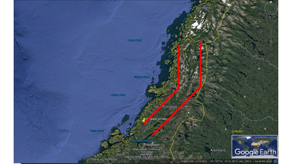 The similarity is quite striking. A NS-structure is found accurately 30° east of the North Volcanic Zone of Iceland, which is aligned exactly NS. The bending structure connecting with the NE-SW oriented East Volcanic Zone of Iceland is found exactly at the same latitude in Norway. In addition, the points 30° apart, of Hekla in Iceland and in the Trondheim area in Norway, are aligned exactly in the same way.