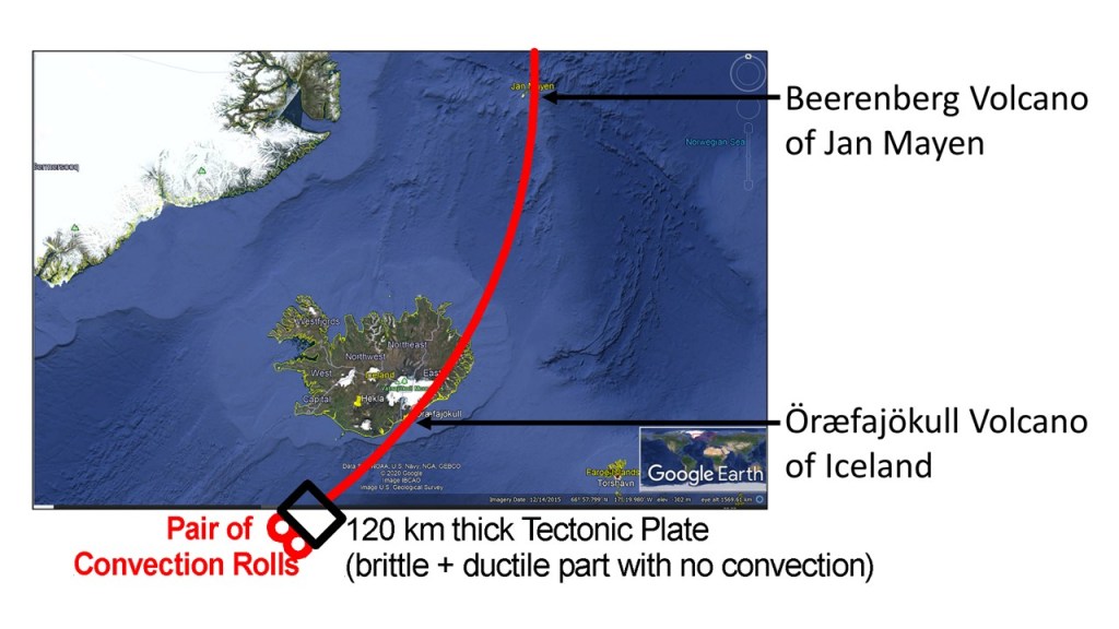 Jan Mayn is a part of the same volcanic structure as Iceland. It can be shown by pointing out the pair of convection rolls connecting the highest volcano of Iceland, Öræfajökull, with the volcano of Jan Mayen, Beerenberg.