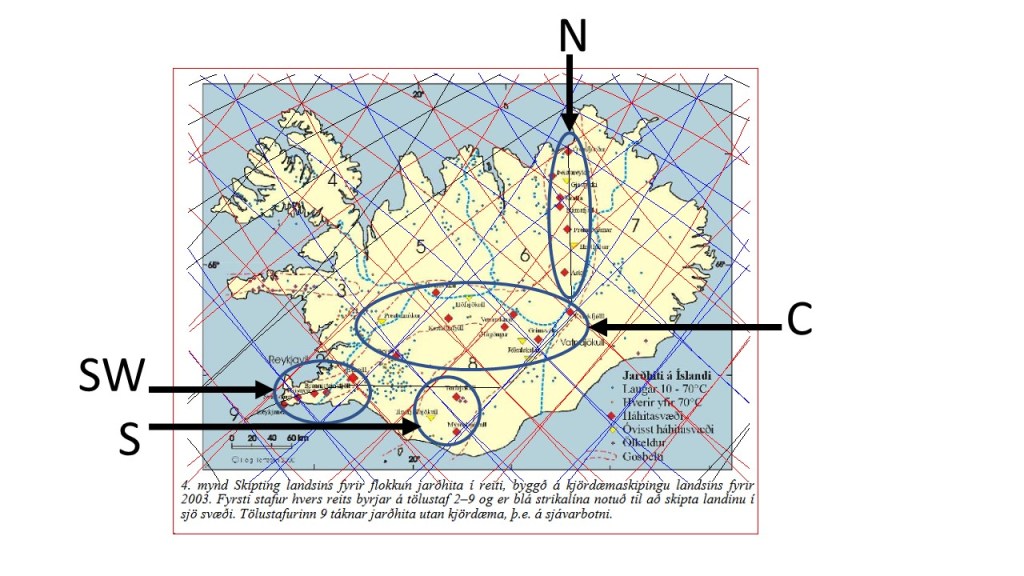 The high temperature areas in Iceland can be divided into four, rather distinct, areas. Here they are marked with SW = southwest (Reykjanes Peninsula), S = South Iceland, C = Central areas, and N = North Iceland.