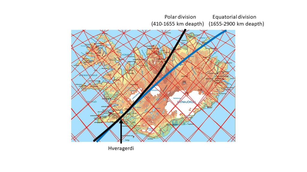 The convection rolls of lower mantle cover 30° from east to west. The Polar and Equatorial parts of the total system intersect each other. The result is that below the 64th parallel, there must be a division within the lower mantle at the depth around 1655 km. The best place on the surface to represent this, is where the two division lines of lower mantle coincide over divergent plate boundaries, namely at the town of Hveragerdi.
