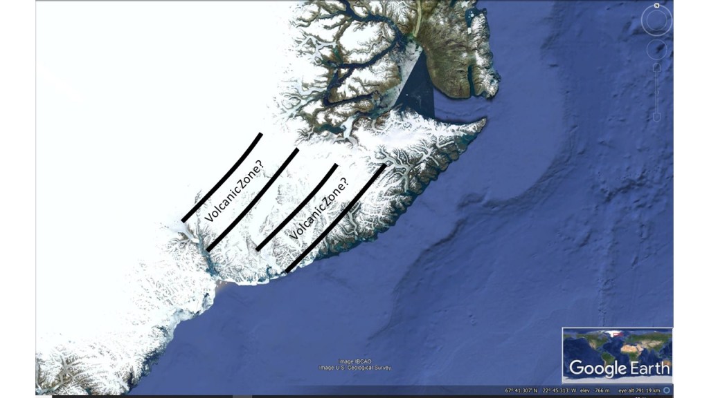 The Tertiary volcanic formations in Greenland south of Scoresbysund are quite similar to Iceland. Therefore there might be found some similarities. The first to look after are traces of volcanic zones. They might look like this: