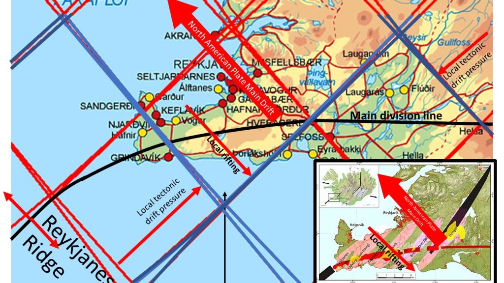 A map from ISOR has been inserted at the lower right corner to show how the volcanic zones form perpendicular to the drift of the North American Tectonic Plate on one hand, and the opposite small scale effect of the eastern Reykjanes Ridge Convection Roll on the other hand.