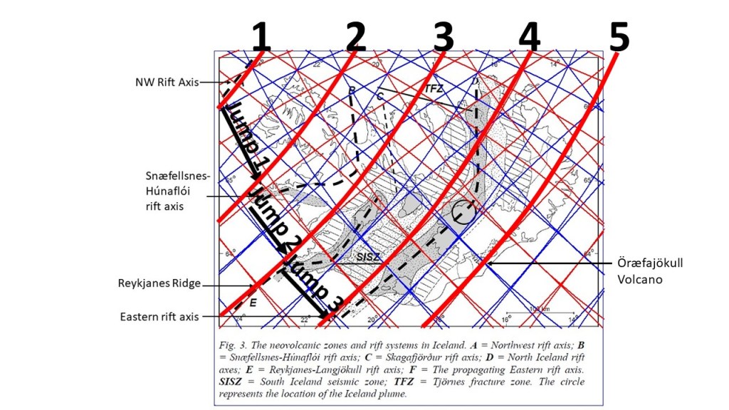 The NW rift axis and the Snæfellsnes-Húnaflói rift axis are extinct, but Reykjanes Ridge and the Eastern rift axis are active. Öræfajökull is found on the fifth line.