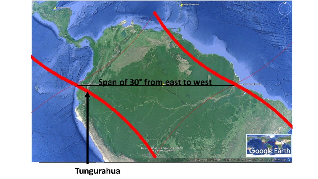 The Amazon area is mostly found within a large polygon marked by the division lines of each side of a single convection roll of lower mantle. The main hub of downwelling forms the esturary of the Amazon River, the largest river in the world. At the other side of the continent, the division line (wide red) between convection rolls does cross the Andes Mountains under the volcano Tuguruahua.