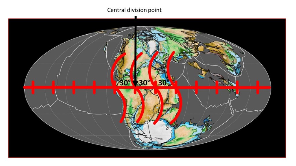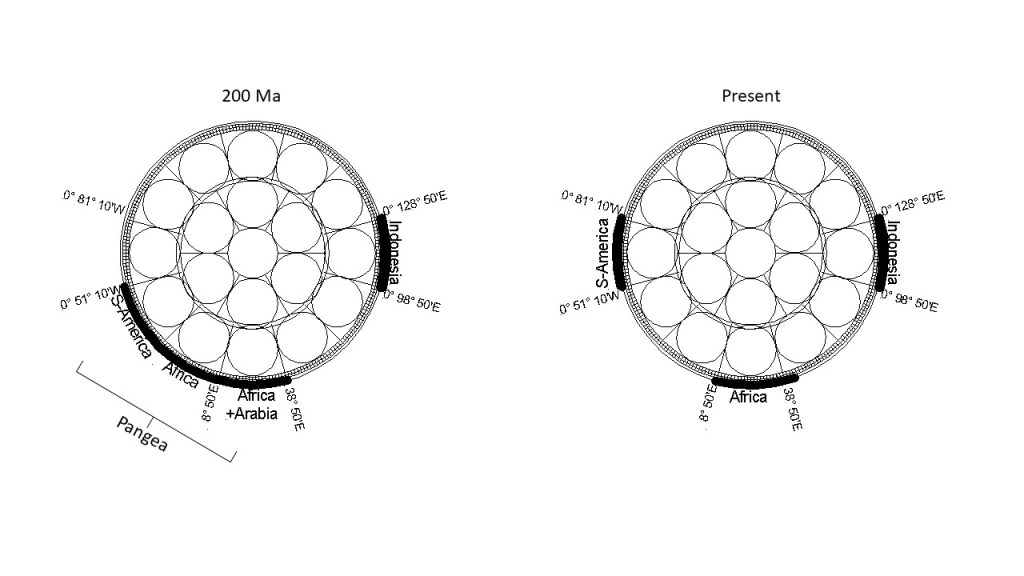 It is interesting that Indonesia has not altered its position according to the map from Wikipedia shown above. The equatorial pattern of 30° intervals is therefore maintained for both 200 Ma and present. For clarity, this drawing can therefore be added: