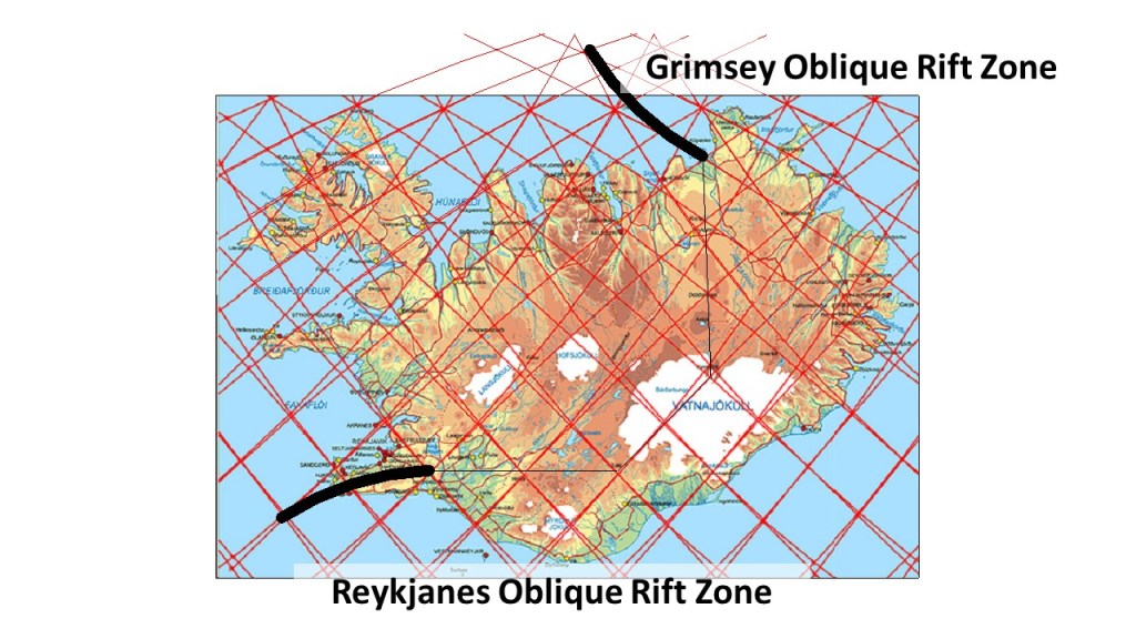 The end points of both oblique rift zones can be compared, as in the South, the main division line over Iceland is directly E-W oriented, whereas the end point in the North connects to a line directly N-S oriented. The other end points connects the zones with the regularly shaped mid-ocean ridges. The bending of the oblique zones takes place within the grid of polygons in a formidable way. Following the division between tectonic plates along the Reykjanes Ridge looks easy, as it follows one single line with a simple formula. Then is starts bending off the track, leading to the formation of Reykjanes Oblique Rift Zone. Then the E-W part takes over, with the South Iceland Seismic Zone and the East Volcanic Zone, respectively. Following the division along the eastern edge of the East Volcanic Zone leads us to the turning point at Kverkfjöll. Then we have a direct N-S line through the central axis of the North Volcanic Zone, all the way to the Öxarfjordur Bay, where a sharp turn is made for the Grímsey Oblique Rift. As has been dealt with in other posts, there are other faults of the Tjörnes Fracture Zone making the situation out of the north coast of Iceland more complicated, with a triple system of the Dalvik Lineament, Husavik-Flatey Lineament along with the Grímsey Lineament (here dealt with as Grímsey Oblique Rift Zone). From the end point, where a volcano called Storagrunn, the Zone is connected with Kolbeinsey Ridge, completing the main division line between the N-American Tectonic Plate and the Eurasian Tectonic Plate.