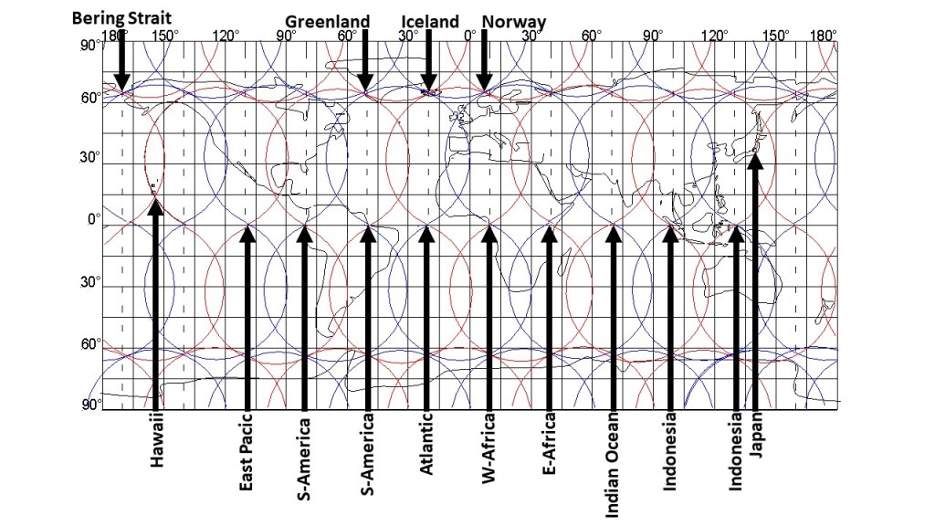 The points selected here with arrow all need special attention. How did the Bering Strait open up? How does the volcanic activity of Hawaii work? The answer is that Hawaii is located over the division line of two large scale convection rolls. The East Pacific main ridge is close to the point pointed out with the arrow here, but there is a smaller ‘side ridge’ at the division point between large scale convection rolls. The west coast of S-America is a prominent point, with a huge trench. Then the Amazon delta is also one of the most decisive equatorial points of the convection rolls system of the Earth. The long stretch of Mid-Atlantic Ridge along equator has of course a point at the center of the ocean, pointed out here. Then, 30° farther eastwards is the west coast of Africa. Going 30° to the east from there, you will see the Great Rift Valley of Africa. Another 30° to the east, the Mid-Ocean Ridge of the Indian Ocean is found exactly where it should be according to this model. Going farther, namely 30° to the east, the west coast of Indonesia provides the base for the next point. Travelling 30° over Indonesia, you will reach the eastern coast. To explore the next division line between convection rolls, it is best to see Japan, actually Mt. Fuji, the most famous volcano of Japan. To further convince oneself of the sensibility of this system, we should have a look at Greenland, Iceland and Norway, providing a pattern over the North Atlantic. The model of the world is so inaccurate that the details cannot be detected, but luckily, I have worked them out also. It is always possible to ‘zoom in’ on each location to analyze in detail what really happens there, when doing so, the interaction between different layers of the mantle can be considered, and you will feel everything starts making more and more sense.