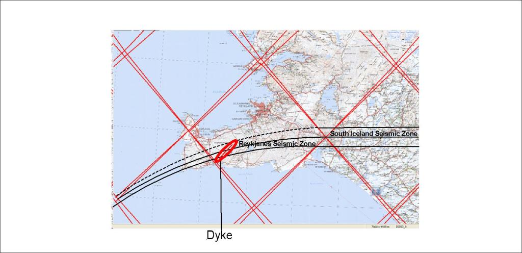 The dyke extends about 8 km over the theoretical area of the seismic zone as extended from South Iceland Seismic Zone over the Reykjanes Peninsula, bending towards the Reykjanes Ridge. It is assumed according to the model that the main part of magma is originated from NW, and when the dyke propagates to the SW, it encounters the division line of the polygon.