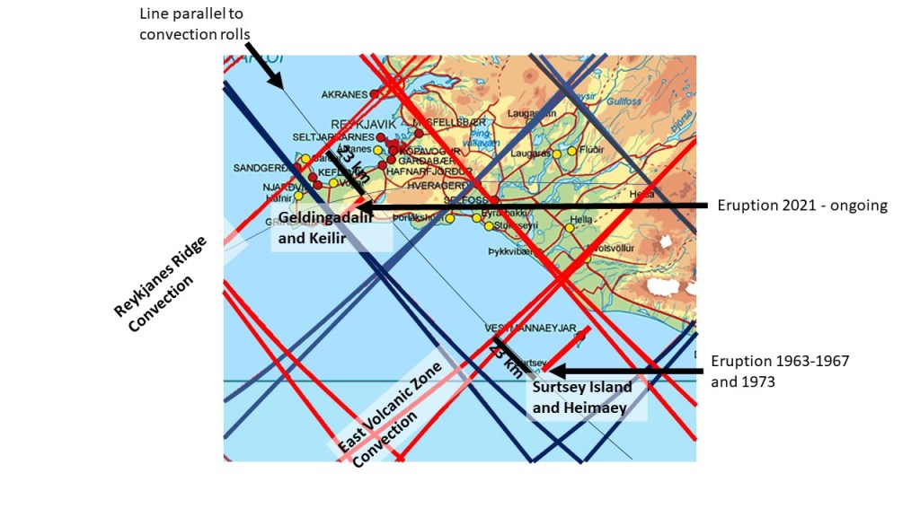 The narrow, black line, parallel to the NW-SE trending convection rolls division line (blue), does cross the ascending spots of magma for Geldingadalir and Surtsey. The Geldingadalir eruption is fed by a dike, but the flow into the dike is not directly below the eruption site, but closer to Keilir Volcano, farther NE. Considering that the lower inflow of magma was more or less directly below Surtsey, the spots are identical for the polygon of Reykjanes and polygon of Westman Islands.