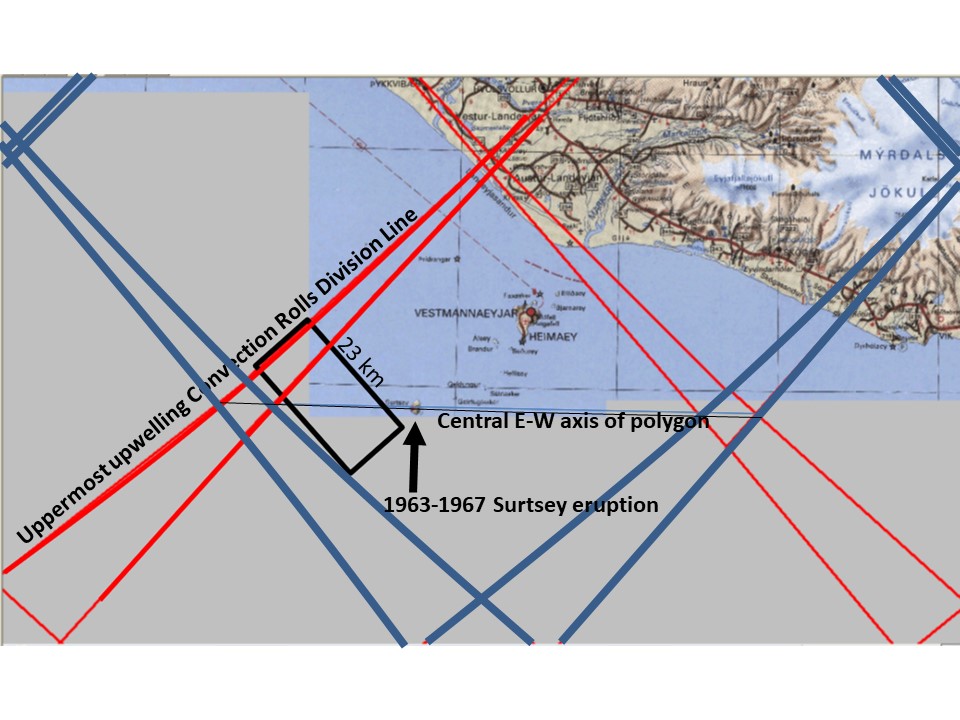 Identical squares with the length of 23 km have been inserted for orientation. The similarities can partly be explained referring to the central axis of the Westman Islands Polygon on one hand and the division line between the N-American Tectonic Plate and the Eurasian Tectonic Plate on the Reykjanes Peninsula on the other hand.