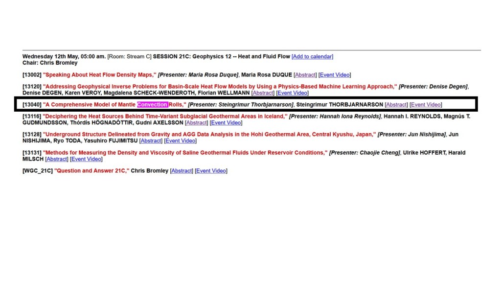 To introduce the model of convection rolls and how it explains the existence and distribution of geothermal resources in Iceland, I take part in the World Geothermal Congress held in Reykjavik this year (2021). The model should better have been developed in the nineteenth century when it was realized that land mass is regularly distributed along equator, and that must be for a reason. Someone should have considered that the span of the Atlantic Ocean and the Indian Ocean of 60° represented two large convecction cells, and the mainland of S-America, Africa and Indonesia span 30°, did show the location of a single large scale convection cell underneath. But no one did, so this became a debate finding place within the twentyfirst century! Harry Hess https://en.wikipedia.org/wiki/Harry_Hammond_Hess was on the correct track in 1962 with the article ´History of Ocean Basins´. Further development effort by the scientific community of his theory would have made this website obsolete. But my video about geothermal resources is found here, meant to bring us all one step closer to the ‘correct track’ again: https://wgc2020-virtual2.velkomin.is/login?redirect=/event/13040