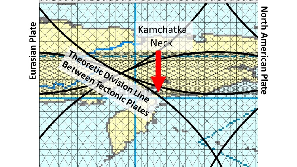 The area of Kamchatka is geologically extremely important, becauase in those areas the North American Tectonic Plate meets the Eaurasian Plate. A main division line of the model used here does cross the peninsulas there.