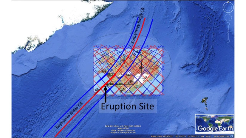 A system of earthquake faults is traceable over the peninsula, and the mountain Fagradalsfjall. The eruption takes place through one of those earthquake faults, with N-S orientation at depth, but NE-SW trend at the top. The NE-SW aligned dike does cros the N-S fault at the side of the mountain, and there the eruption takes place. The system of earthquake faults does sway from the E-W oriented South Iceland Seismic Zone over the peninsula, only to become adjacent with the Reykjanes Ridge. As the faults become filled with additional lava, gravity anomalies develop as a result. This is a likely explanation why the so-called V-shaped ridges form semi-parallel to the Reykjanes Ridge. Those are not real ridges, but gravity anomalies due to this additional mantle material which has consolidated within the crust.