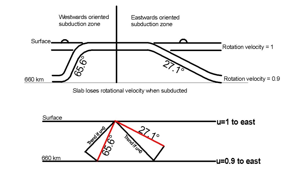There is a clear difference between subduction zones facing east (slope 27.1°) and west (slope 65.6°), on the average. The first reason to be examined is Earth’s rotation. Slab is subducted about 660 km, close to 1/10 of Earth’s radius, and therefore it loses rotational velocity on the way. As this happens very slowly, it might be overlooked, but this is actually what happens. All this mass loses considerable amount of kinetic energy to the environment during the process. This fact constantly alters the slab dip as it descends into the mantle. It occurs linearly, having rotational speed u=1 at the surface, and u=0.9 close to the depth of 660 km. The Earth’s radius is 6,370 km, and therefore we roughly say that when fully subducted it has lost 10% of original rotational velocity.