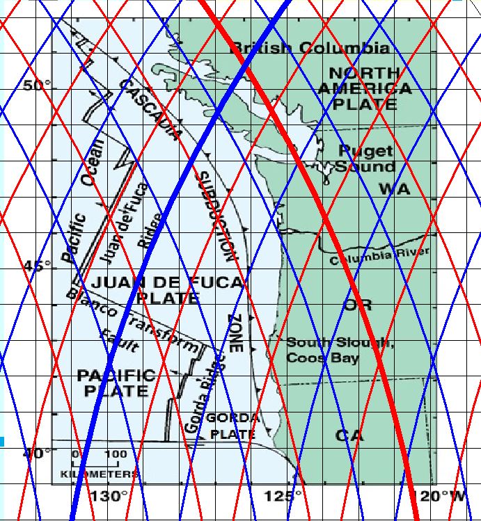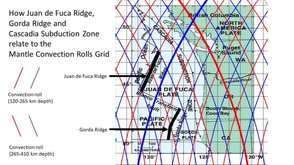 There are many details to be noticed, even though this map is not nearly as accurate as could be provided. The Blanco Transform Fault extends between two points where division lines cross each other, because those are points of weakness in the deep tectonic framework. The Gorda Ridge bends at the border line between polygons, as the stress field changes there. The Cascadia Subduction Zone bends back and forth along a lower convection rolls division line. As most people have not yet learned about the convection rolls system, and its implications, it is good to check the present state of knowledge regarding Juan de Fuca plate and its development on the Wikipedia site: https://en.wikipedia.org/wiki/Juan_de_Fuca_Plate.