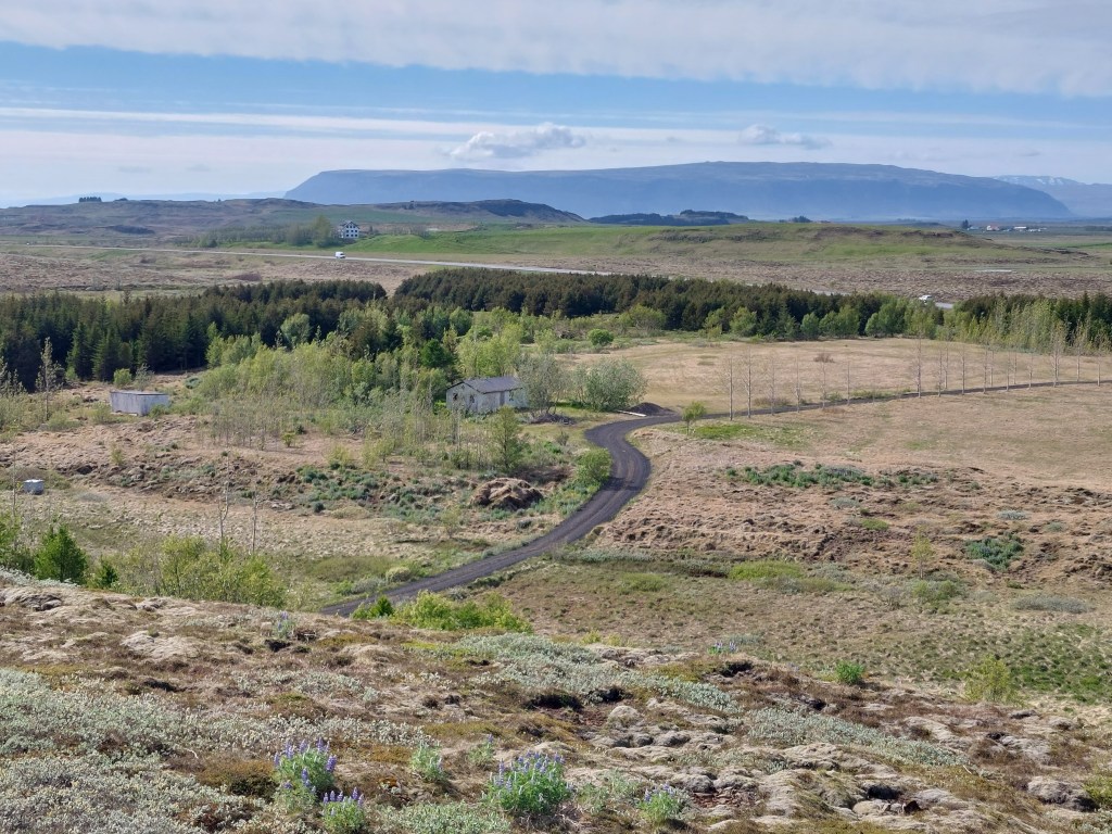 The fault area (the crack extends between the small houses), and Ingólfsfjall in the background.