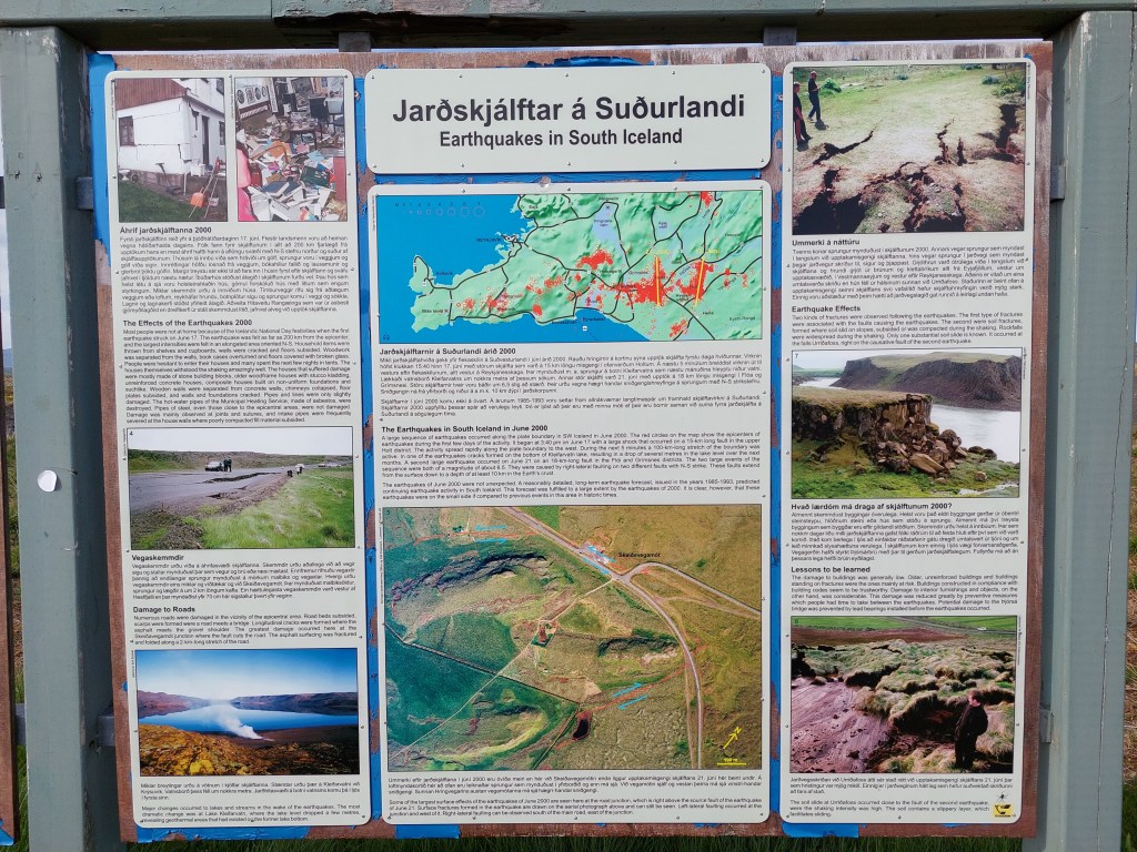 The side of Ingólfsfjall seen above is actually marked by an earthquake fault, oriented directly N-S. This is just south of 64°N, the central latitude of the South Iceland Seismic Zone. The faults themselves are all parallel, with the average distance of 715 meters in between them.