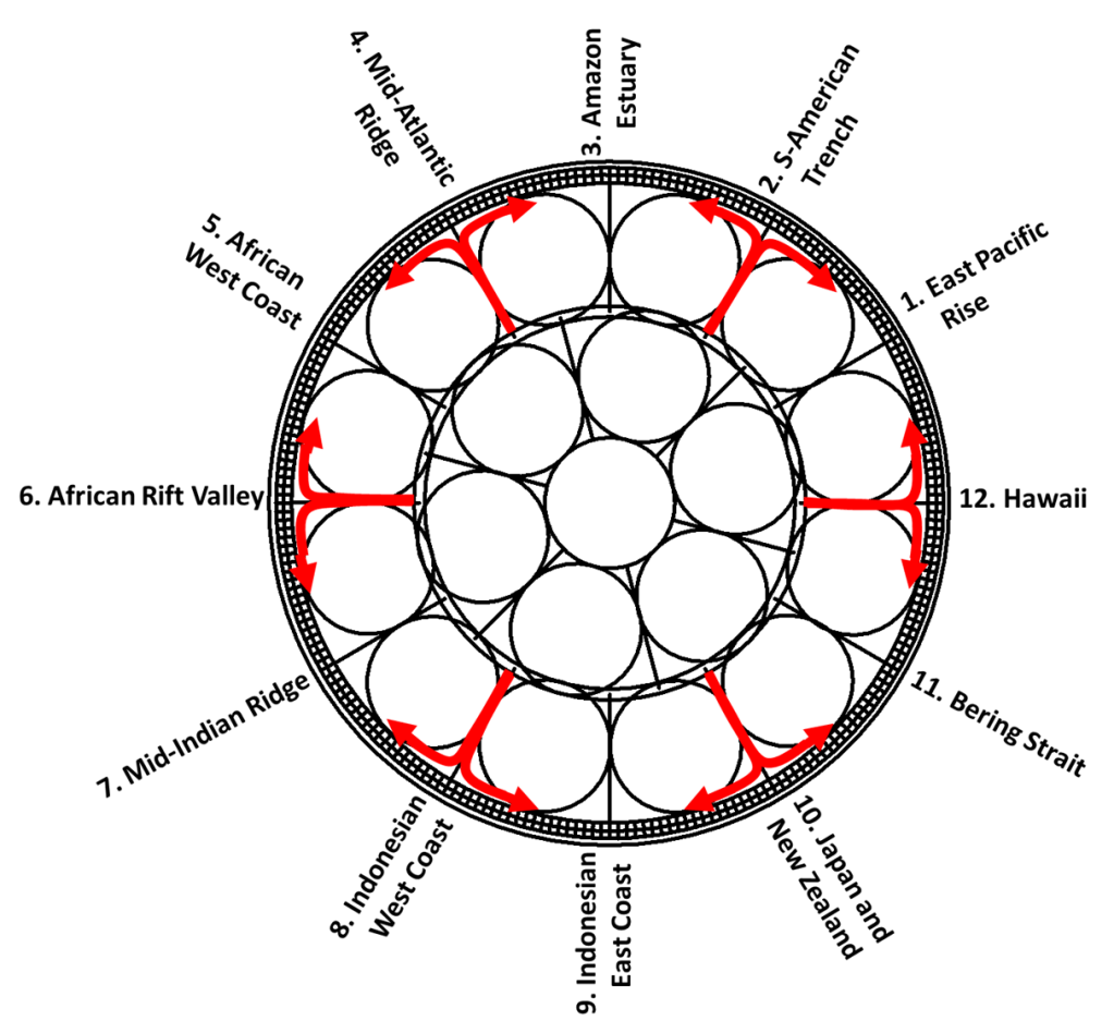 When the derived circle families are plotted on a world map, individual boundaries often align with major geological structures. These alignments are not assumed in advance; they become testable predictions.