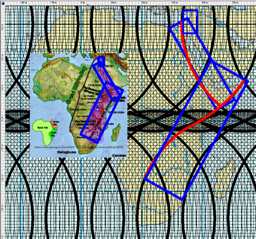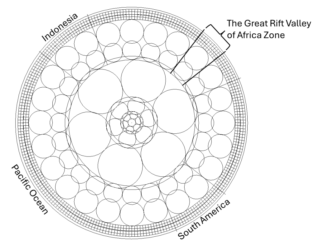 At the equator, the inferred boundaries in the lower mantle pass directly through the central rift zone. This is the only location on Earth where such deep mantle boundaries appear to coincide with continental surface structures. From this point, the angular distance is approximately 60° to the western coast of Indonesia and about 30° to the eastern coast of Africa.