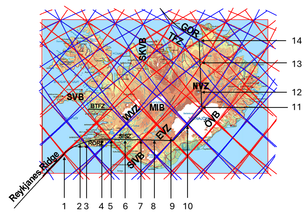 To the west, the system begins offshore at the Njörður volcanic site, an area characterized by frequent earthquakes. This location acts as a shifting point in the tectonic framework. South of it lies the typical structure of the Mid-Atlantic Ridge, which can be traced according to a regular geometric pattern as it extends southwestward. At Njörður, however, the ridge bends more sharply toward Iceland, marking a transition from a classic mid-ocean ridge into a more complex on-land system with volcanic systems, grouped into volcanic zones.