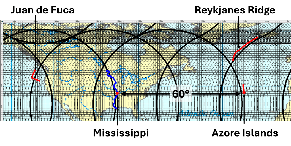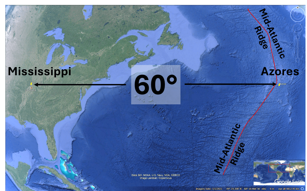 A similar longitudinal distance appears elsewhere in the Atlantic system. At the equator, the distance between the Mid-Atlantic Ridge and the west coast of Africa is also approximately 30°. Furthermore, the Atlantic Ocean spans about 60° of longitude between the estuary of the Amazon River in South America and the African coast. The recurrence of these angular distances, 30° and 60°, suggests a possible large-scale structural regularity in mantle dynamics.
