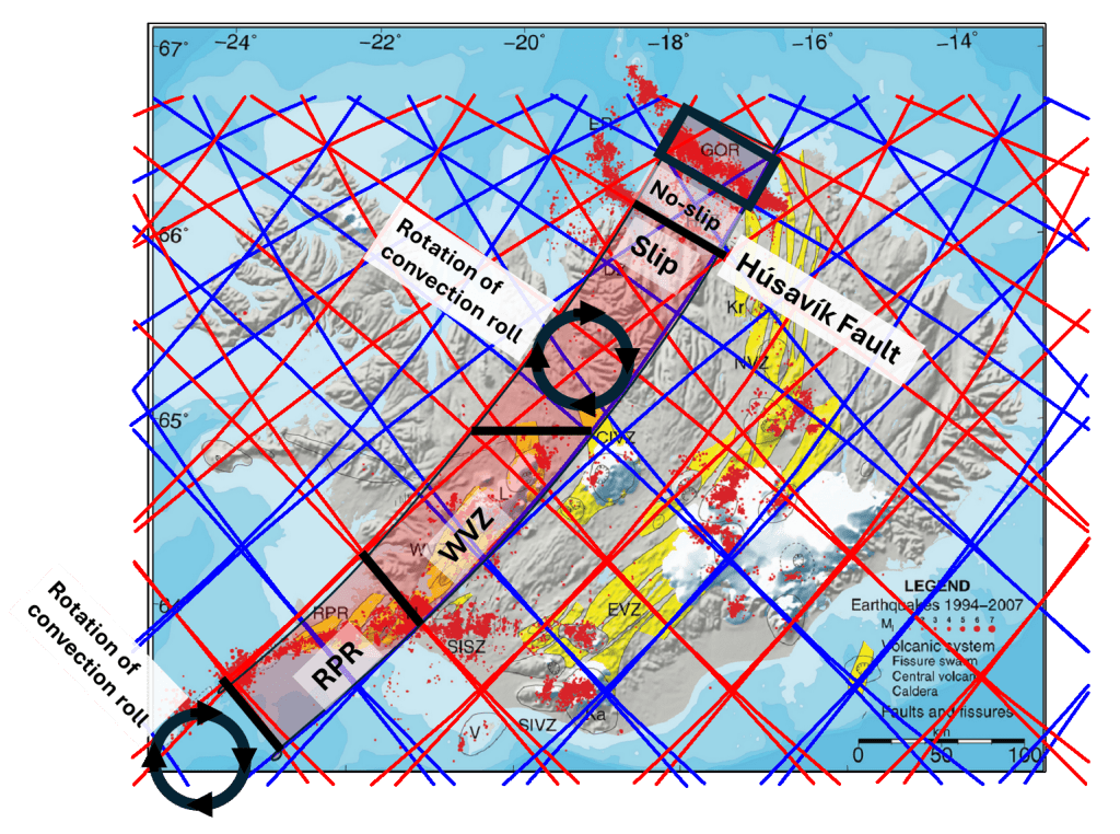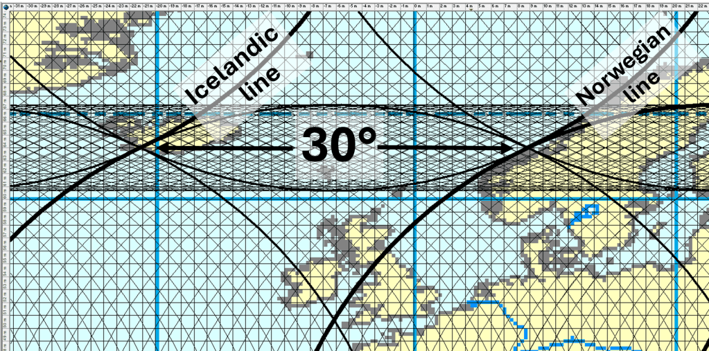 The distance between central Iceland and the coastal regions of Norway corresponds to 30 degrees of longitude along the relevant parallels near 64°N. Within the framework of the mantle convection roll model, this spacing is consistent with a predicted division between adjacent lower-mantle flow rolls.