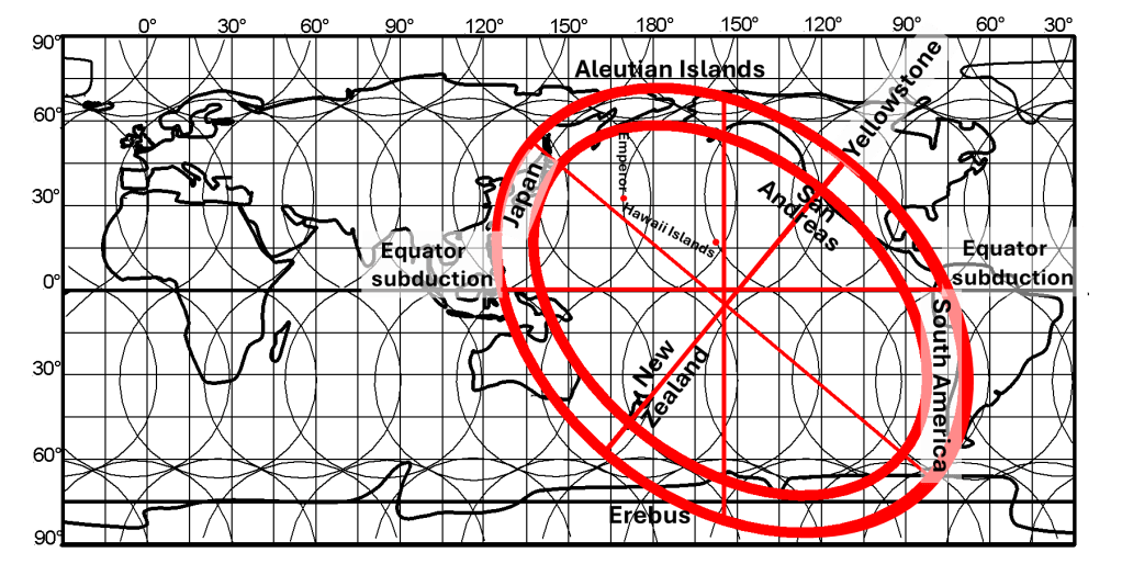 Within this framework, the Hawaiian–Emperor chain is interpreted not as an isolated volcanic phenomenon, but as the surface expression of an upwelling pathway associated with a convection-roll division line extending from the central Pacific northward to the edge of the Ring of Fire. The apparent continuity between Hawaii, the Emperor Chain, and the northern Pacific margin reflects the global coherence of the roll geometry, reinforcing the view that the Ring of Fire is part of a single, planet-scale convective structure rather than a collection of unrelated tectonic features.