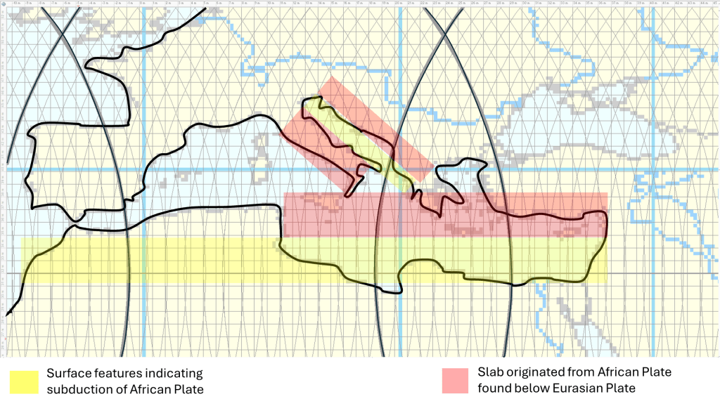 It is known that Italy has rotated and the Adriatic Sea has thereby been enclosed with slab reaching under both Italy and the Balkan Peninsula. The African Plate subducts below the Aegean Sea, Sicily and Turkey. Subduction from the north and the appearance of ocean floor due to spreading is omitted here. The lines resulting from the Convection Rolls Model can be seen, and of course the main purpose of this study is to compare that model with what is known about the geology of the area. For this short post, it is mainly pointed out that the North Coast of Africa coincides with the 32nd parallel where the convection rolls are aligned directly N-S. One aspect of that latitude is that two downwelling lines of two different layers coincide, and thereby also two upwelling lines of two layers coincide. This creates the opportunity for convergent boundaries to appear, if the downwelling part is the dominant factor (no-slip) and the upwelling part becomes neutral (slip). A consequence of this is that extension within the area is then mainly caused by the north component of drift of the Eurasian Tectonic Plate, as the subduction is mainly related to the conditions close to 32°N.