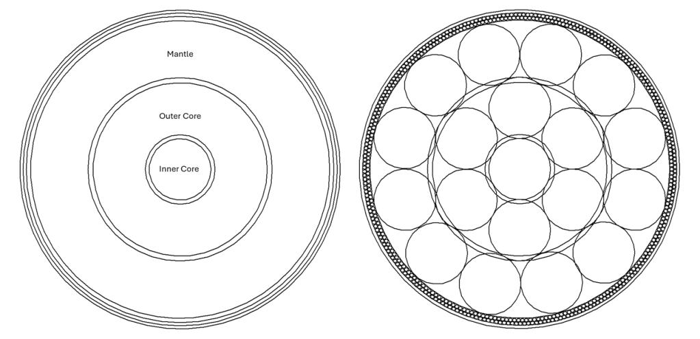 This drawing shows how the convection rolls are arranged directly above each other. It also shows secondary convection rolls within the lower mantle. The Lehmann layer of the core is omitted here. The system can then be traced northwards and southwards, and the global system derived, which is described here.