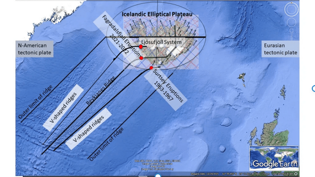 The eruptions of Surtsey and Fagradalsfjall can be compared with the recent seismic activity of Ljósufjöll volcanic system at the roots of the Snæfellsnes Peninsula. The V-shaped ridges found on the Reykjanes Ridge also fit into that comparison.