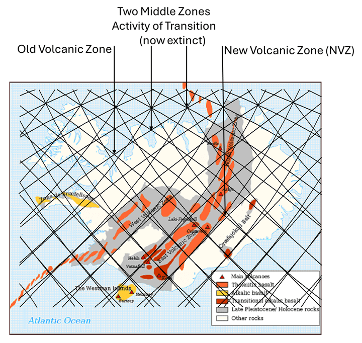 North and South Iceland seem to be quite different, as there are many volcanic zones active in the south, but only one in the north. The North Volcanic Zone (NVZ) in the north-eastern part of the country replaced the volcanic zone in Húnaflói, extending from Snæfellsnes Peninsula. But volcanic activity has been found in between these two zones in the past, mainly 1-2 million years ago. The Skagafjörður Volcanic Belt was a rift zone, widening the fjord by about 10 kilometers until activity came to an end. Also, activity did occur north of Eyjafjörður, and created for instance Grímsey, where the rocks are known to be around 1 million years old. https://www.visindavefur.is/svar.php?id=4435