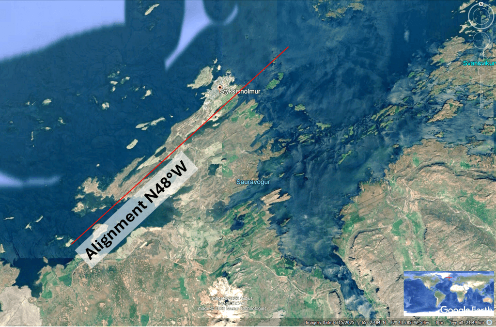 At the same time, the surface morphology of the peninsula has been strongly modified by repeated glaciations. Glacial erosion has carved valleys and lineaments that follow a different dominant alignment. Interestingly, this second alignment also corresponds to another predicted set of division lines within the convection rolls model. In other words, both the geothermal fracture system and the glacially sculpted surface features appear to reflect deep structural patterns rooted in mantle convection dynamics.
