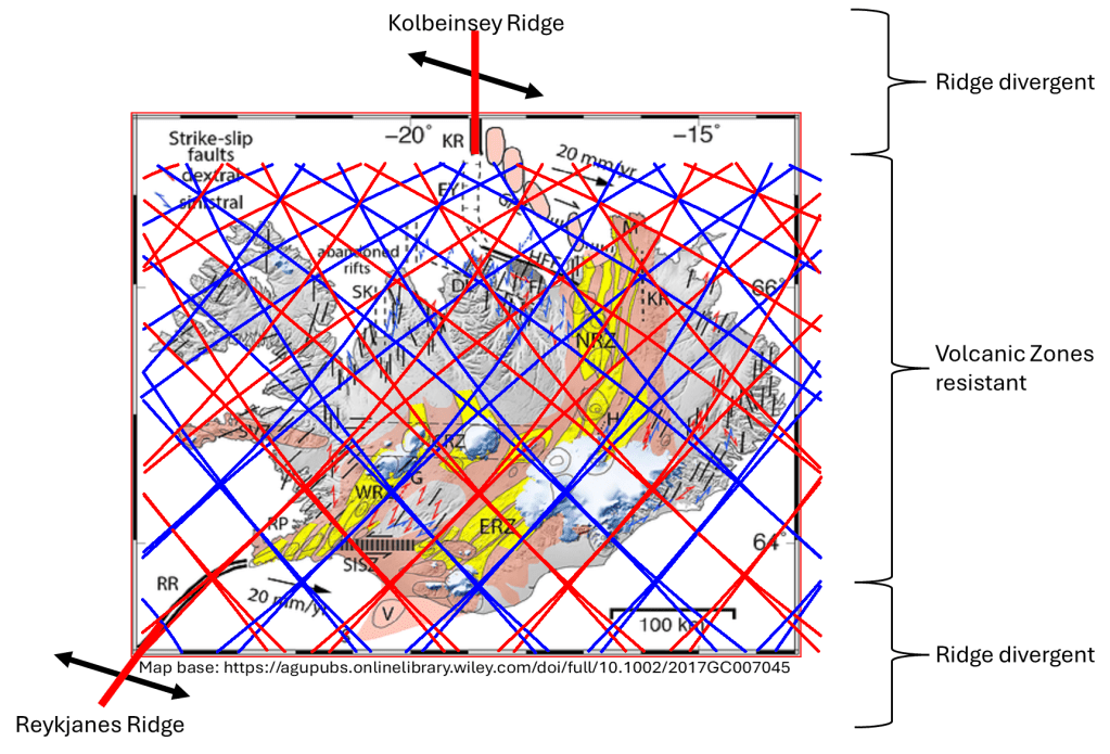 A useful way to visualize this is to imagine convection rolls arranged side by side, like parallel cylinders. In this framework, the Reykjanes Ridge occupies precisely a boundary between two of those rolls, and its path follows the equation given above with notable accuracy. At Iceland’s latitudes, tectonic activity becomes more diffuse. Instead of being confined to a narrow ridge, divergence is distributed across broader volcanic zones. This produces a wider ara of deformation, magmatism, and surface restructuring. As a result, the structural signal of the underlying convection is expressed not only with a single line, but across a much wider region.