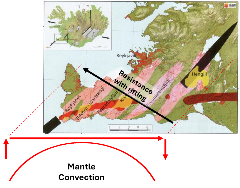 This type of rifting appears to result from resistance: the surface plate motion is not fully aligned with the underlying mantle flow. While the large tectonic plate moves in one direction, local mantle convection may flow in the opposite direction. This interaction creates resistance, and it is this resistance that leads to broader and more complex rifting zones.